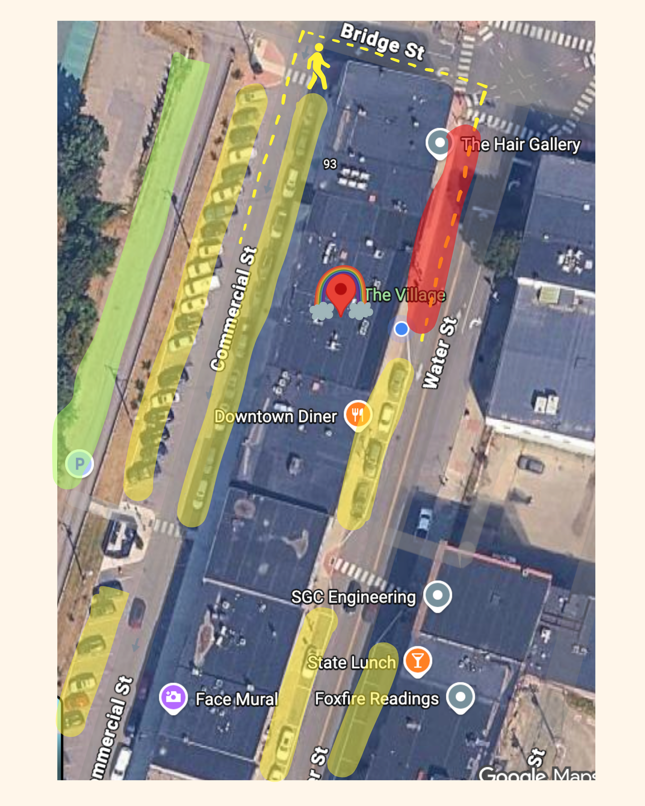 Please note that parking on Water Street ENDS just before The Village doors. There is NOT street parking from the intersection to the doors (highlighted in RED.) Street parking is highlighted in YELLOW on this map. If you cannot find parking in any of the YELLOW areas, there is more parking on the dirt road above Commercial Street (highlighted in GREEN!)